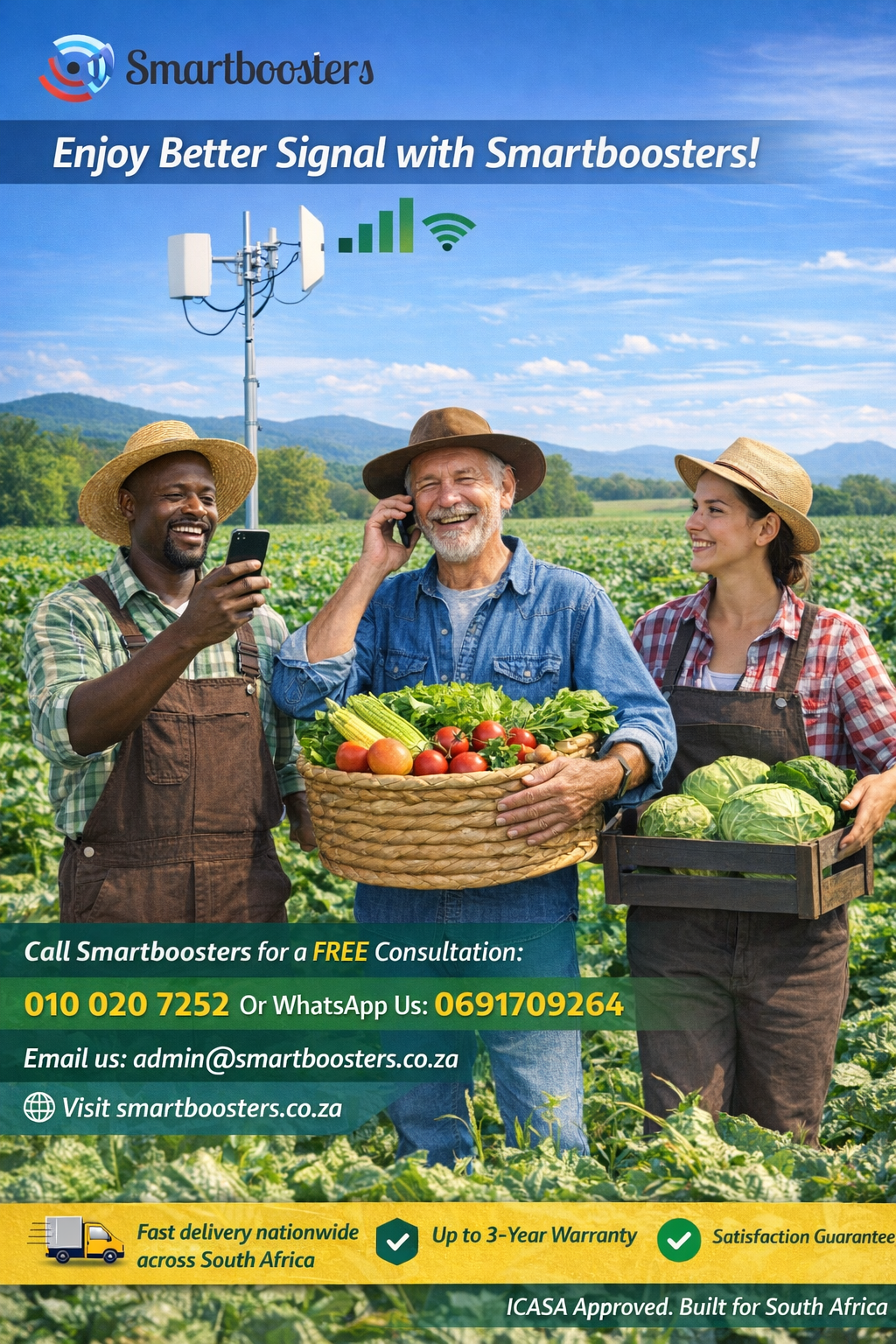 Smartboosters has delivered signal solutions to farms and agricultural properties across the Western Cape, Eastern Cape, Northern Cape, KwaZulu-Natal, Mpumalanga, Limpopo, North West, Free State, and Gauteng. From wine estates in Franschhoek to macadamia farms in Limpopo, from sheep farms in the Karoo to sugarcane operations in KwaZulu-Natal — the Smartboosters team understands what South African farms need and how to deliver it.
